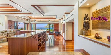 With a short journey of 25 miles north of the Kona (KOA) Airport, our home, expansive and airy, has cool koa wood and marble floors giving a heavenly feel under bare feet, 20-foot-high ceilings allow you to breath and sliding glass doors leading to the grassy bluffs above the sea bring the sunset home. With 245 days of sunshine annually coupled with a mere 7 inches of rainfall, you will be happy indoors or out.